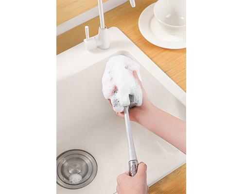 双色搭配加长柄,轻松刷洗高深保温杯,红酒杯等;加大海绵刷头配搭粗面网孔海绵,对窄口杯,杯子底部边角轻松刷洗;带刀片的榨汁机也能轻松清洗不伤手。